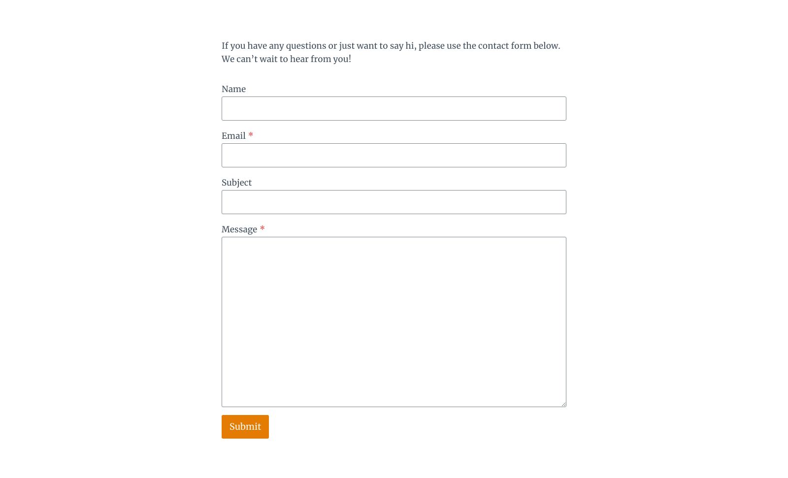 If you have any questions or just want to say hi, please use the contact form below. We can’t wait to hear from you! NameEmail*SubjectMessage*EmailSubmit Please enable JavaScript in your browser to submit the form
