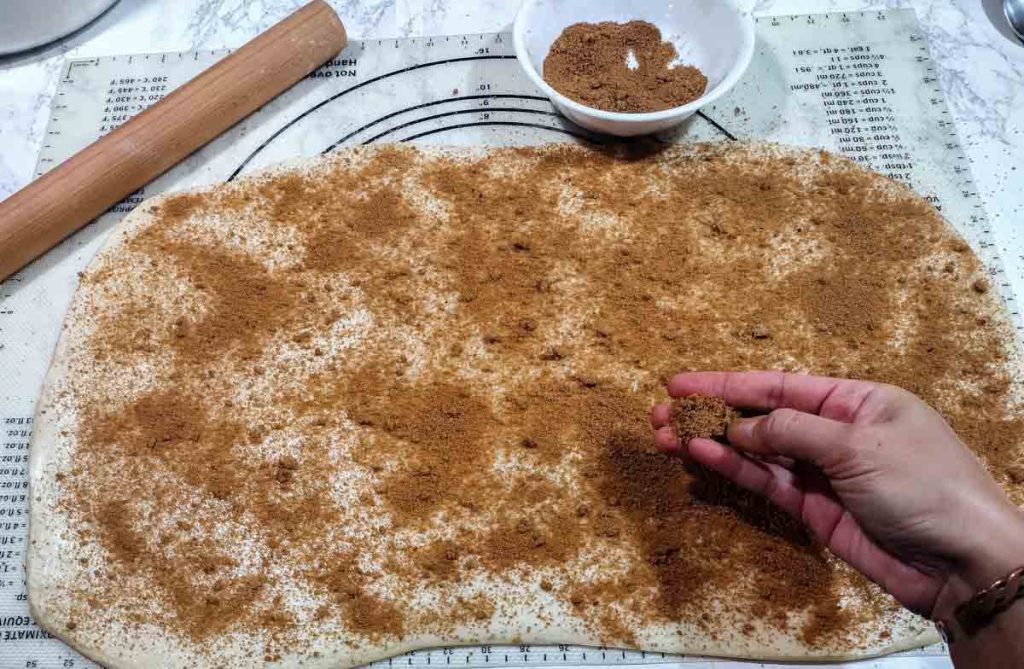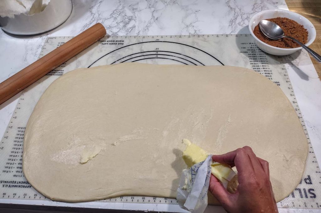 5. On a lightly floured surface, roll the dough into a large rectangular shape. Spread the softened butter over the dough. Then, sprinkle the cinnamon-sugar combination over the butter.