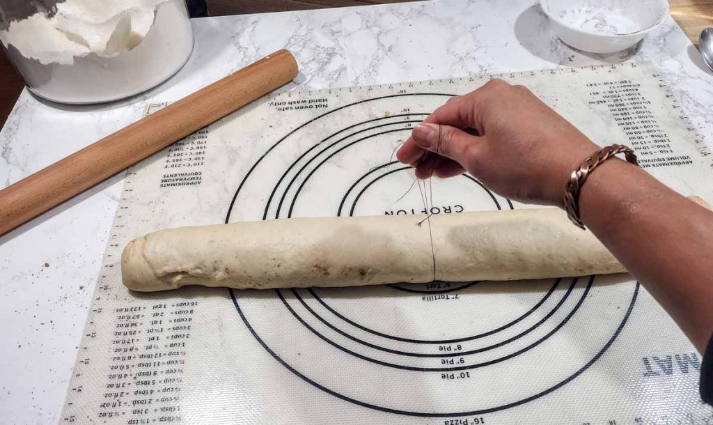 6. Roll the dough starting at the long sides to form a log. Pinch the edge to create a seam. Place it seam-side down. Use a thread, knife, or a bench scraper to slice and divide the dough into equal parts.